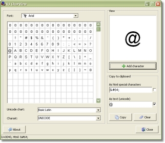 A font character viewer capable of showing Unicode characters even on Windows 98. It can display ranges above 0xFFFF as well. Also, it shows some common code pages and lets you copy the characters as text (Unicode) or as html special characters. Full source is available.